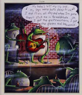 Ocko Odstrániť stránku Vtipný vtip pochádza z humoru tohto Garyho Larsona a pýta sa, čo sú blues obojživelníci. Odpoveď samozrejme 緑 Existuje cesta, ktorá otriasla zlá gitara s nízkym, stojacim vrcholom, zvukmi a žabami. Mám zlú zelenú farbu 。 ''