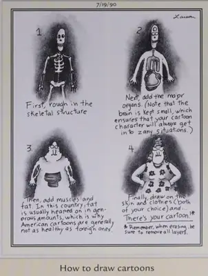 Tento panel je nezabudnuteľný ďalší panel Odstrániť stránku Gary Larson, vyrobený v roku 1990. V lete je to metamálny vtip a je jednou z najcennejších perforovaných línií, ktoré sa začali v najlepšom zmysle Larsona. Podnadpis Ako nakresliť karikatúru , Panel Návrh je porovnateľný s jazykom v procese farby. Začína sa lebkou a naznačuje hodnotenie podporného inžinierskeho prístroja a kostrovej mozgovej príhody, tela a oblečenia.