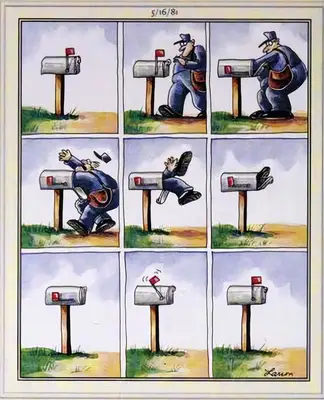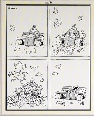 Gary Larson Odstrániť stránku Bol jedným z mnohých komiksov od Únie, ktorému, ako viete, sa vyhýba na prelome štyroch Charles Schulz. Drzý Odstrániť stránku Mnohé z nich pozostávajú zo samostatných panelov, ale niekedy výnimky, keď sú hodné.